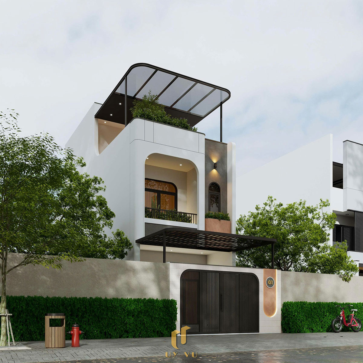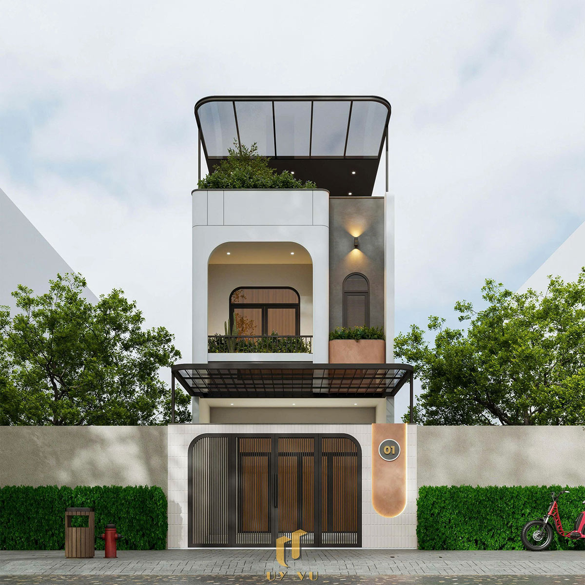 Công trình nhà anh Duy gây ấn tượng ngay từ cái nhìn đầu tiên với mặt tiền mang phong cách hiện đại, nổi bật bởi những đường cong mềm mại được xử lý tinh tế trên tổng thể hình khối. Sự kết hợp giữa tông trắng – xám chủ đạo cùng các chi tiết kiến trúc bo góc không chỉ tạo nên vẻ ngoài thanh thoát mà còn giúp công trình trở nên khác biệt giữa dãy phố.