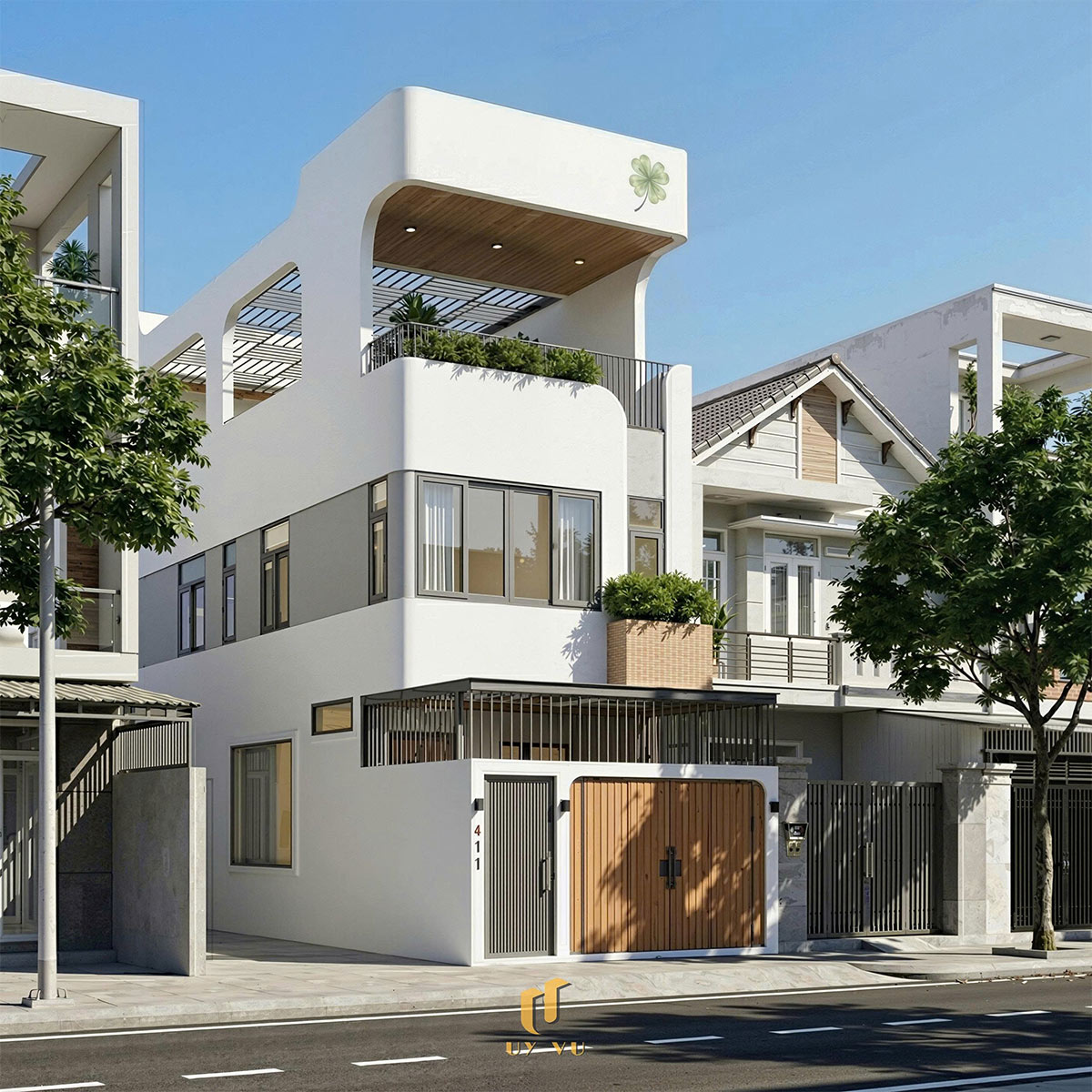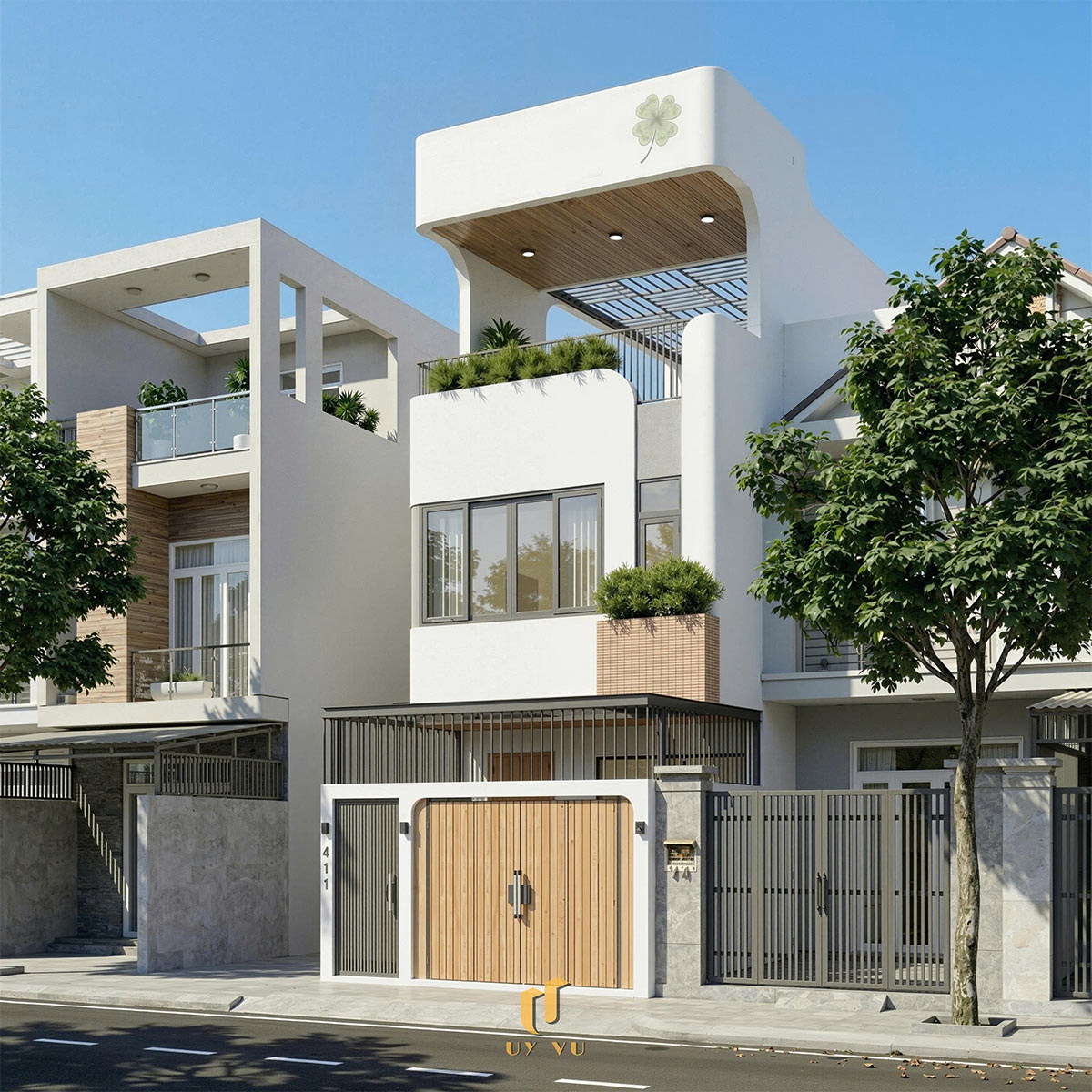 Công trình nhà chị Duyên mang phong cách hiện đại tối giản, nổi bật với những đường nét bo cong nhẹ nhàng kết hợp cùng bố cục hình khối rõ ràng, tạo nên một tổng thể hài hòa và thanh thoát. Tông trắng chủ đạo được phối cùng các chi tiết gỗ ấm áp ở khu vực cổng và trần ban công, mang lại cảm giác gần gũi, tinh tế nhưng vẫn giữ được nét hiện đại đặc trưng.