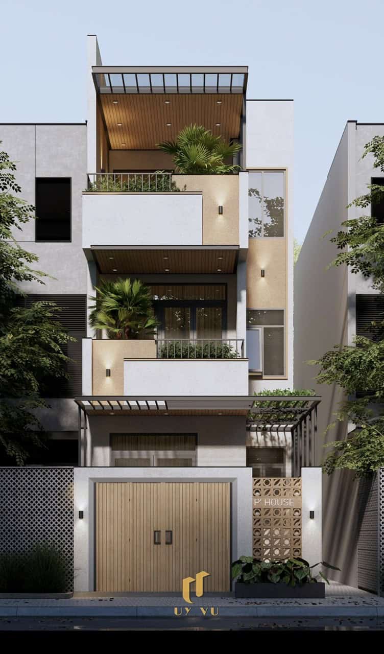 P’ House được tạo nên từ những mảng khối hiện đại, gọn gàng và đầy chiều sâu thị giác. Mặt tiền sử dụng tông màu trung tính kết hợp chất liệu gỗ ấm, tạo cảm giác sang trọng nhưng vẫn gần gũi.