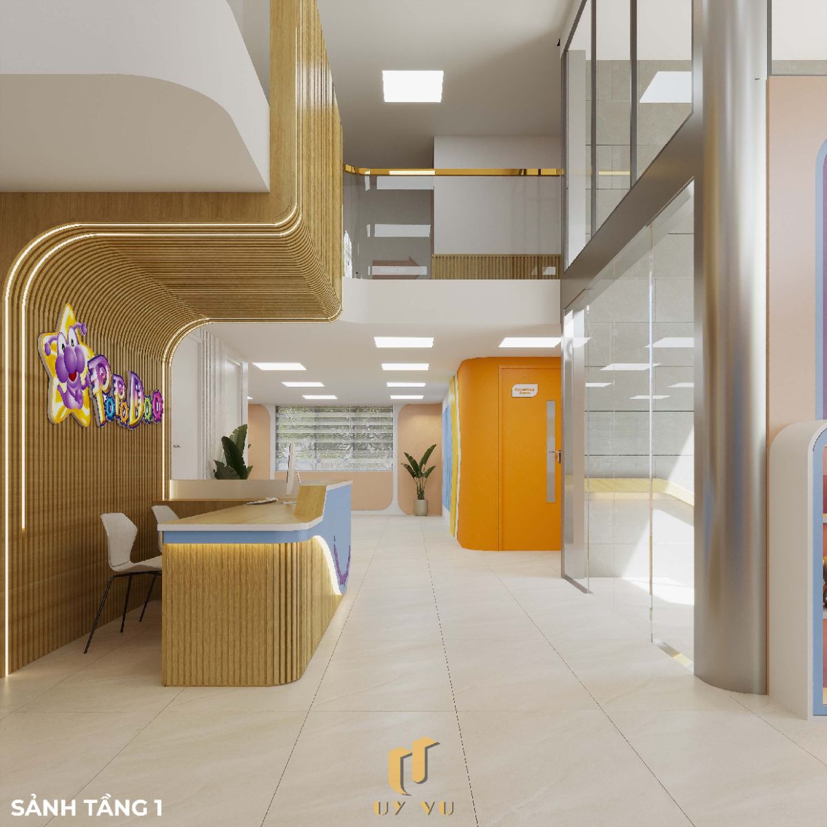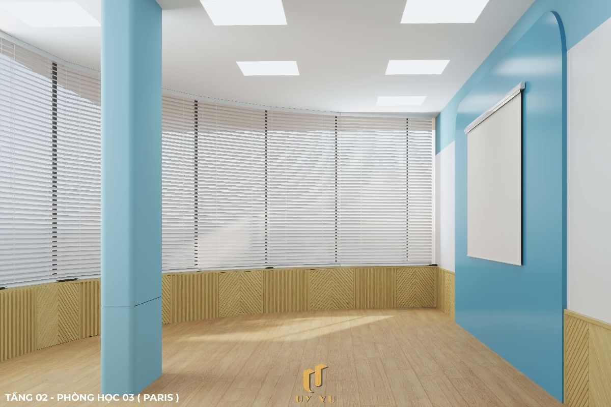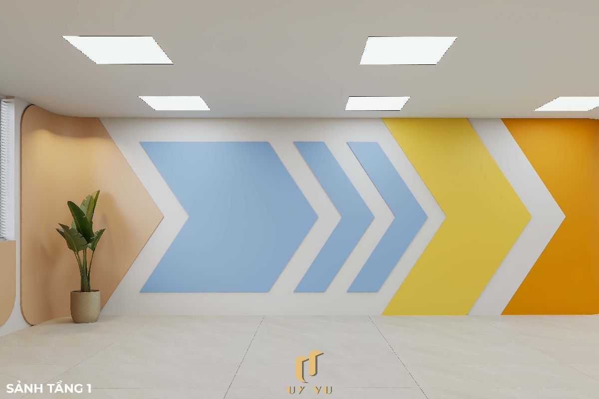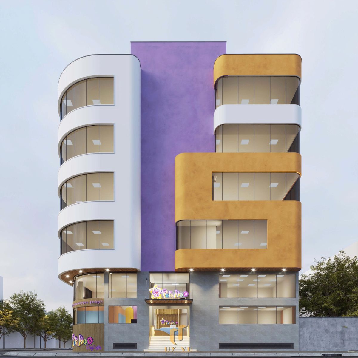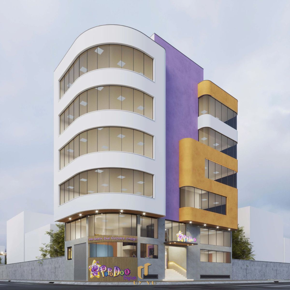 Trung tâm Anh ngữ nổi bật với thiết kế kiến trúc hiện đại, kết hợp hài hòa giữa những đường cong mềm mại và mảng màu sắc tươi sáng, tạo nên một không gian năng động và sáng tạo.