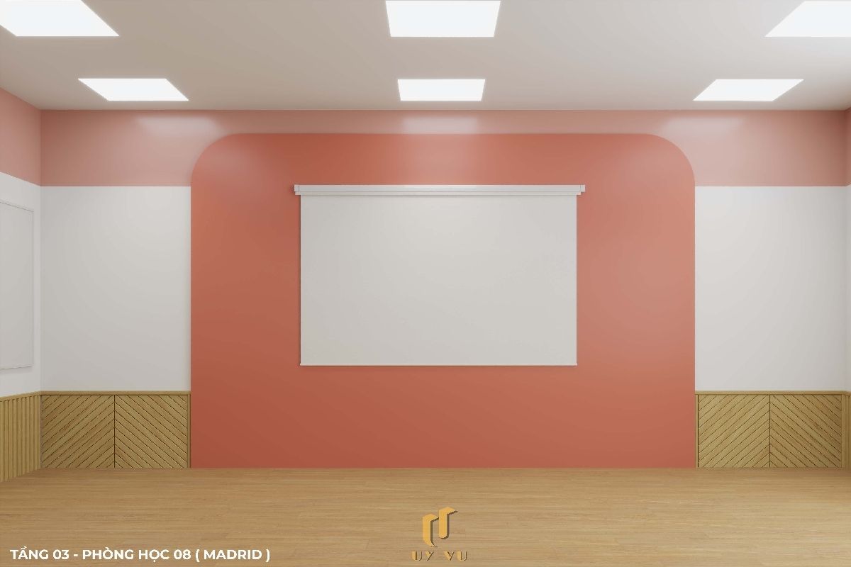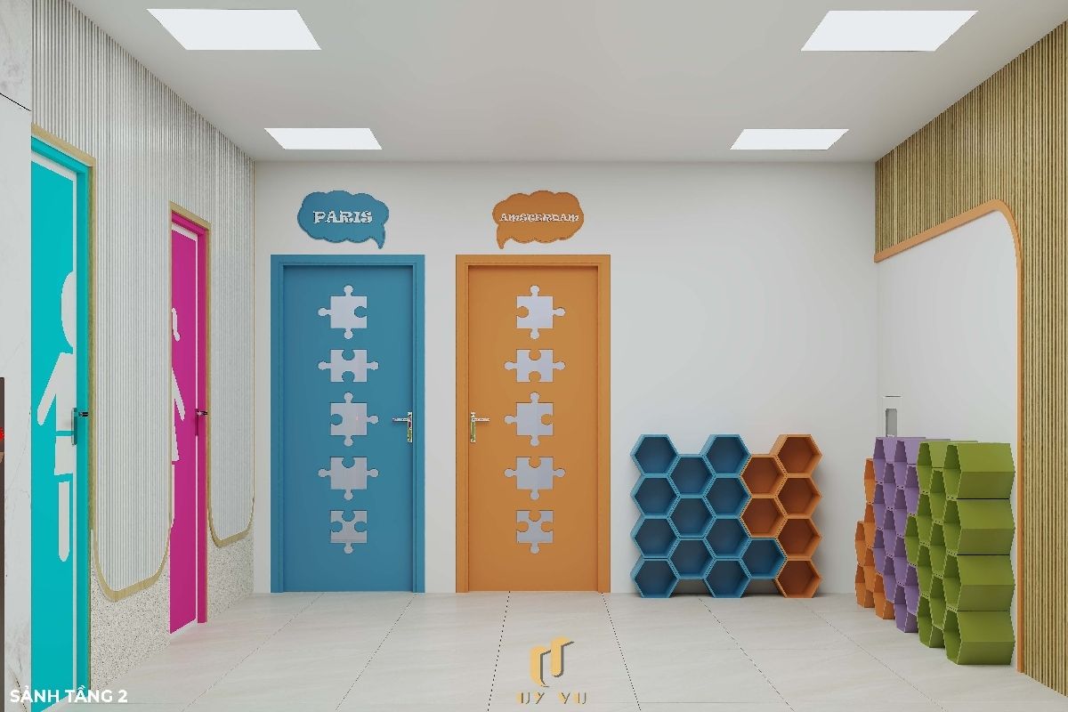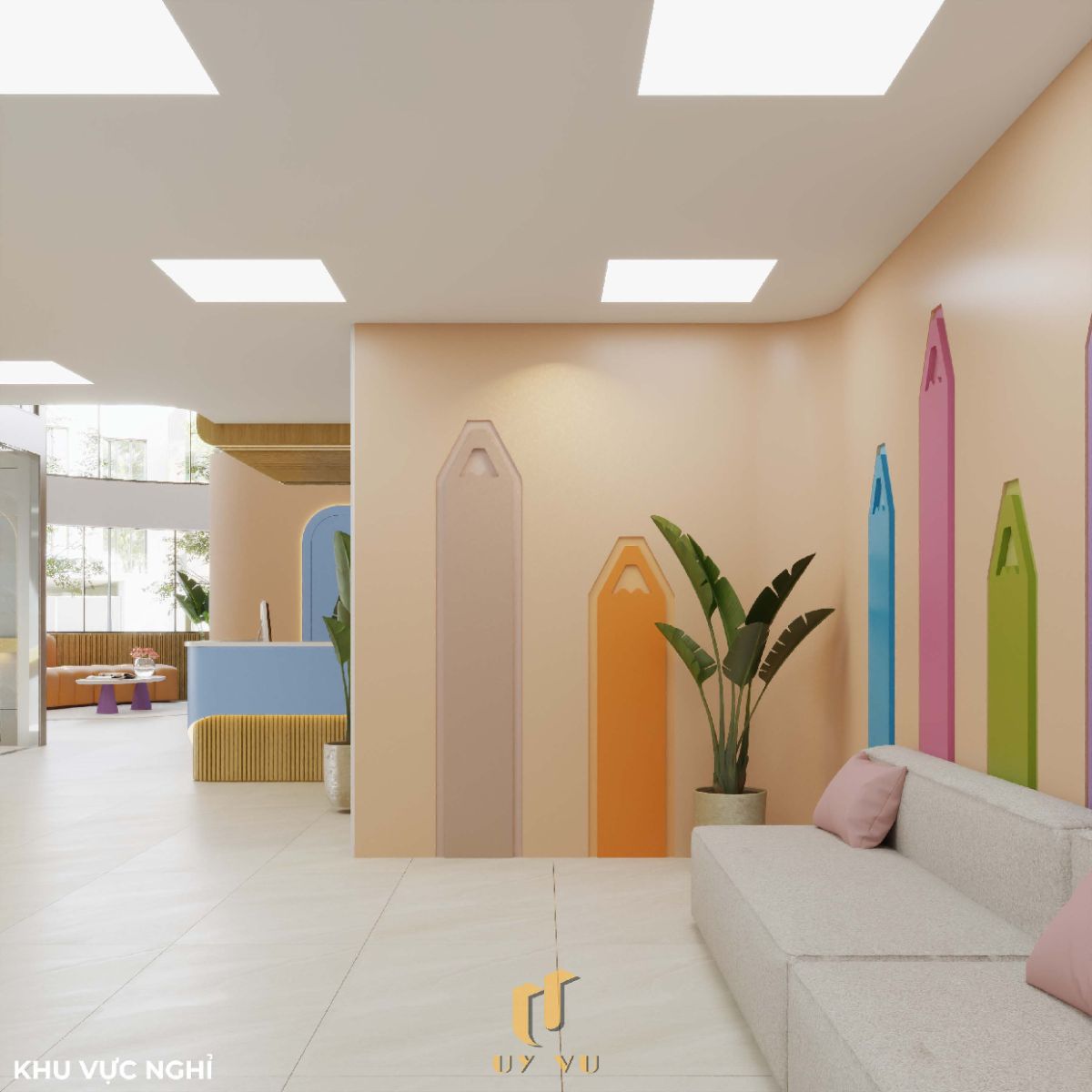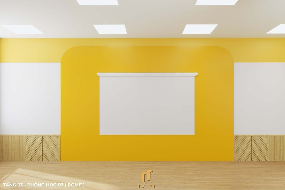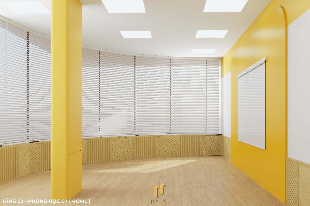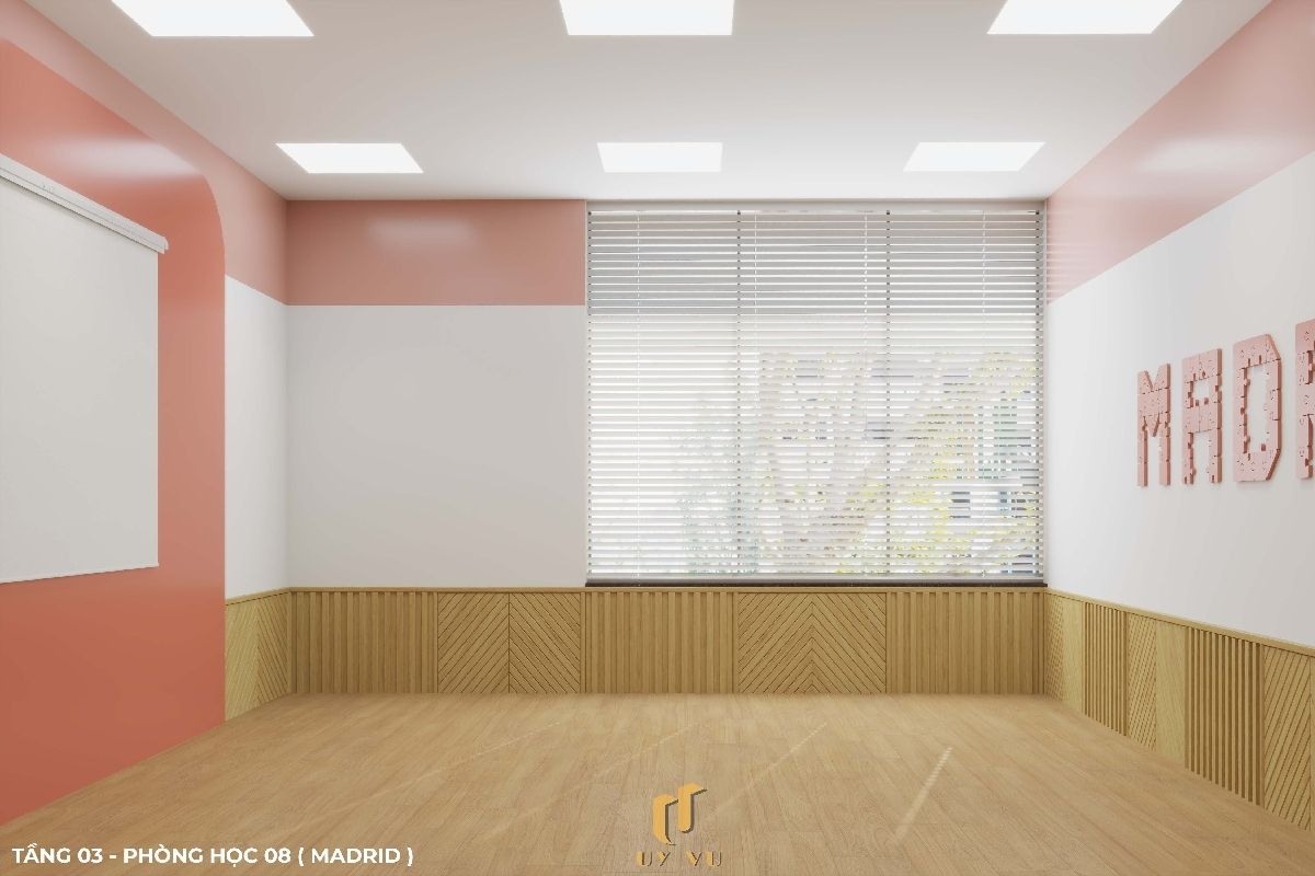 Trung tâm Anh ngữ nổi bật với thiết kế kiến trúc hiện đại, kết hợp hài hòa giữa những đường cong mềm mại và mảng màu sắc tươi sáng, tạo nên một không gian năng động và sáng tạo.