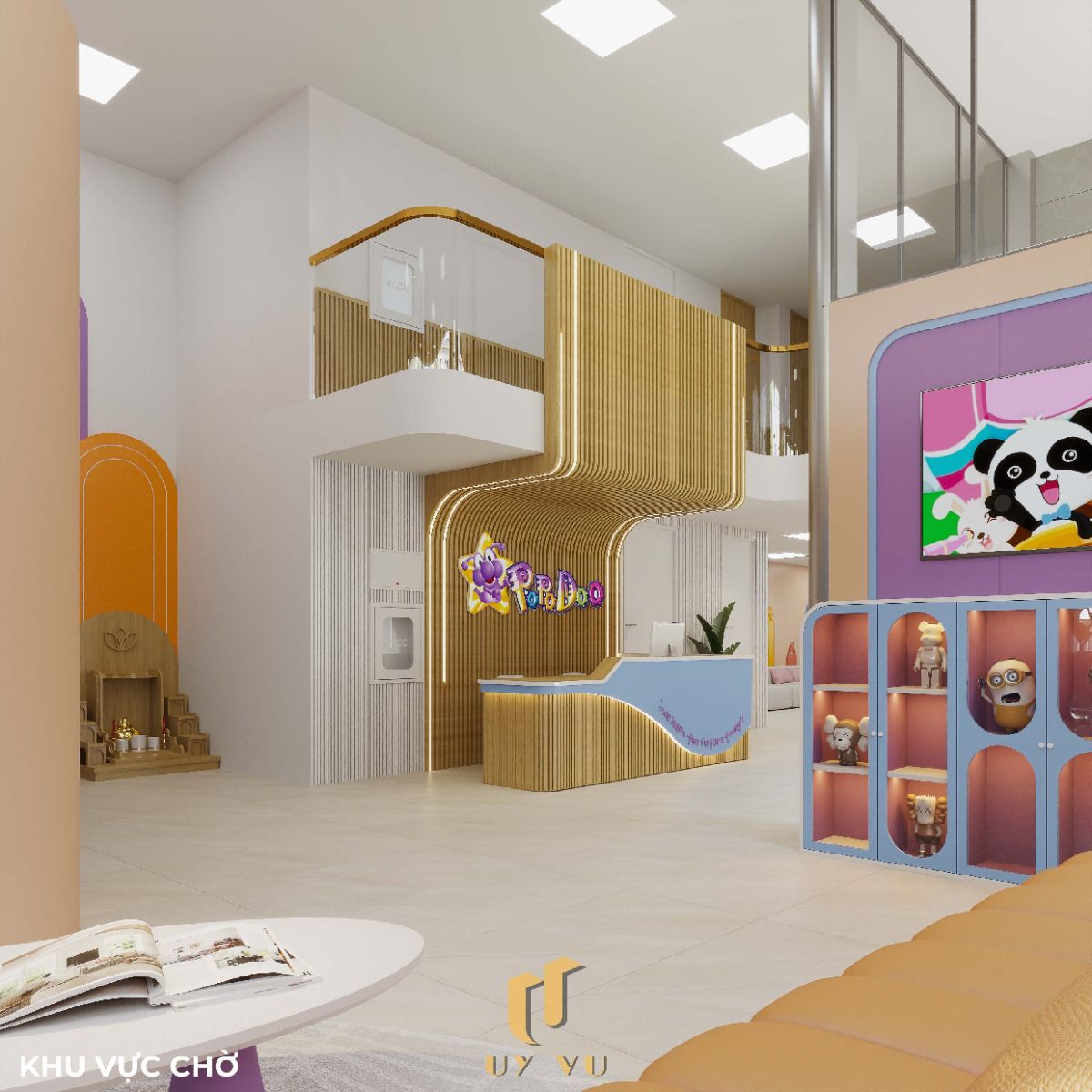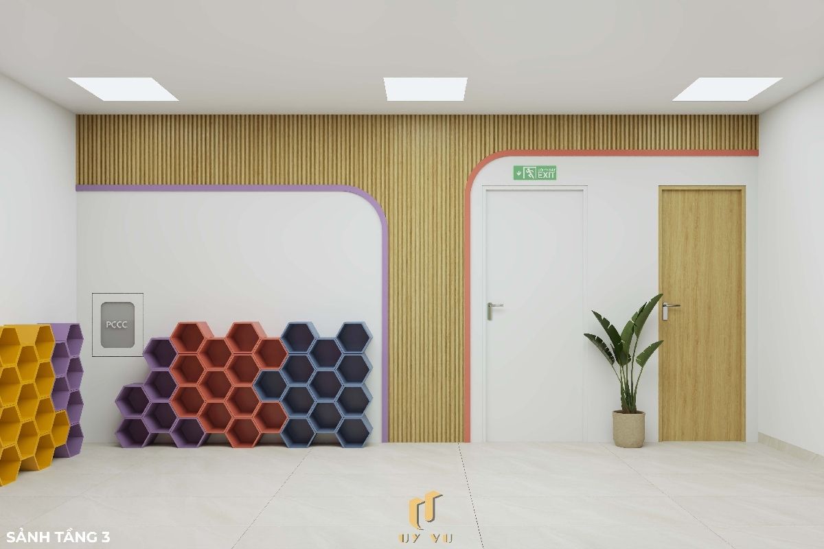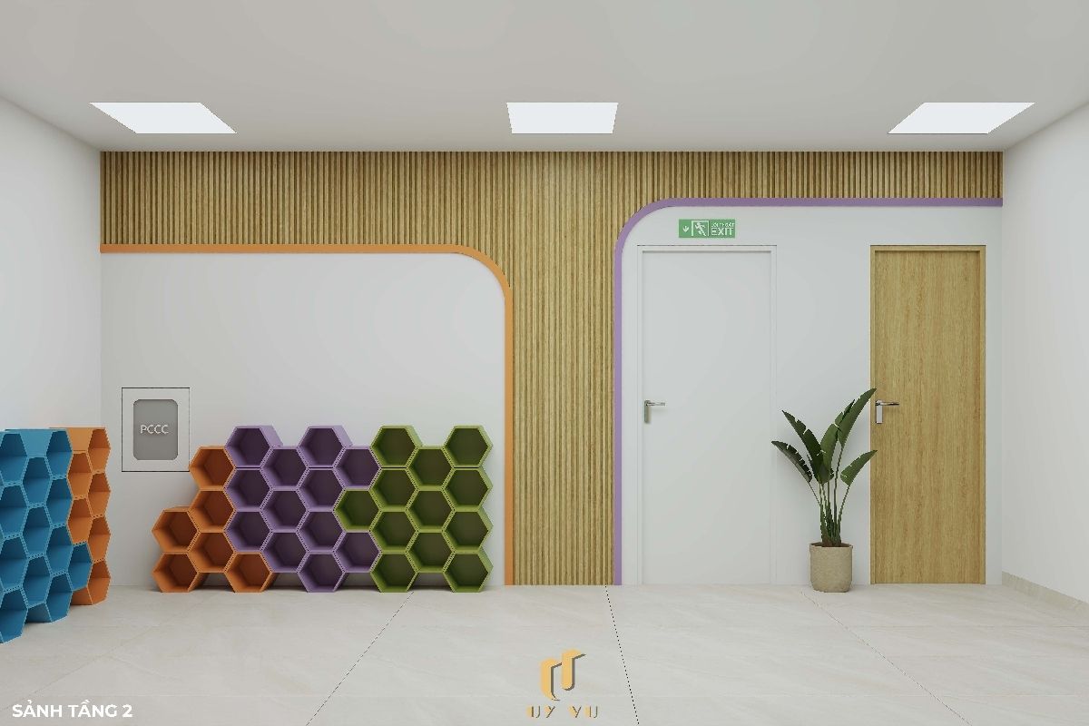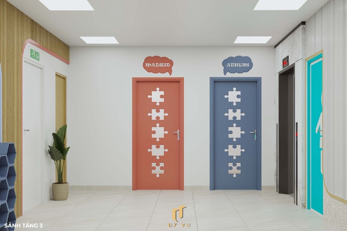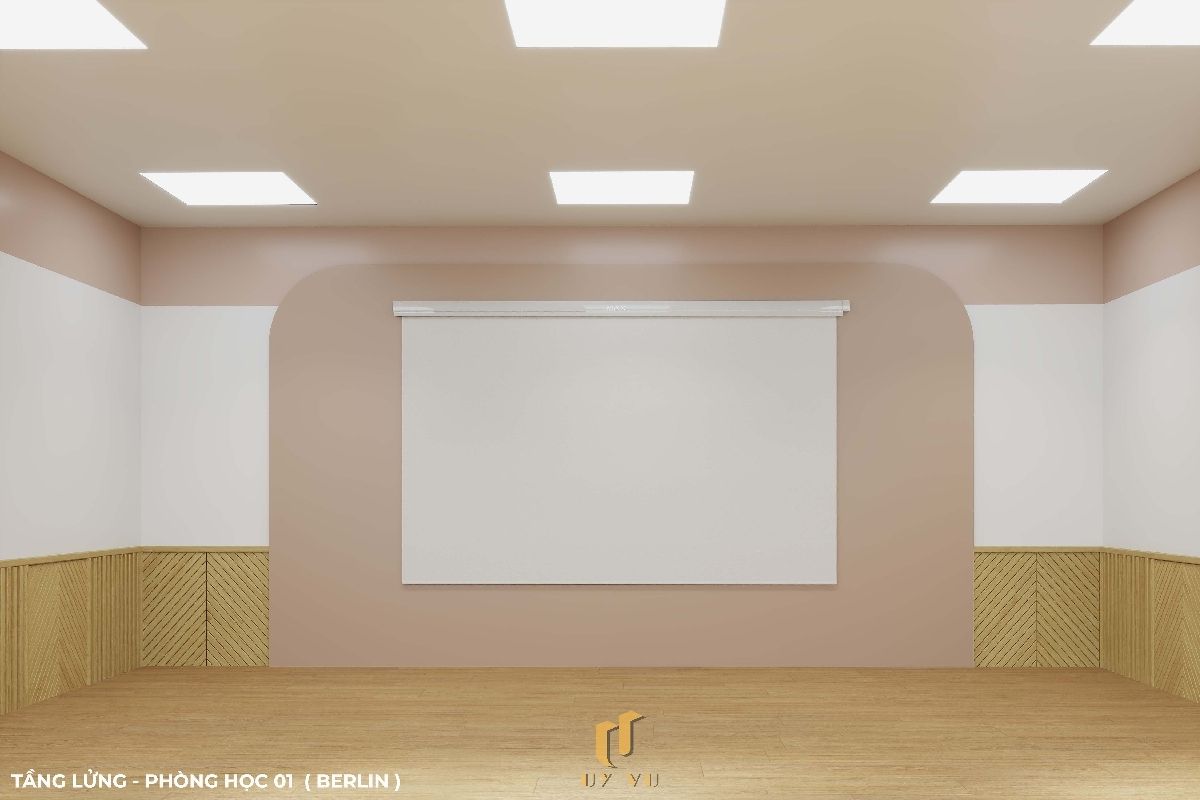 Trung tâm Anh ngữ nổi bật với thiết kế kiến trúc hiện đại, kết hợp hài hòa giữa những đường cong mềm mại và mảng màu sắc tươi sáng, tạo nên một không gian năng động và sáng tạo.