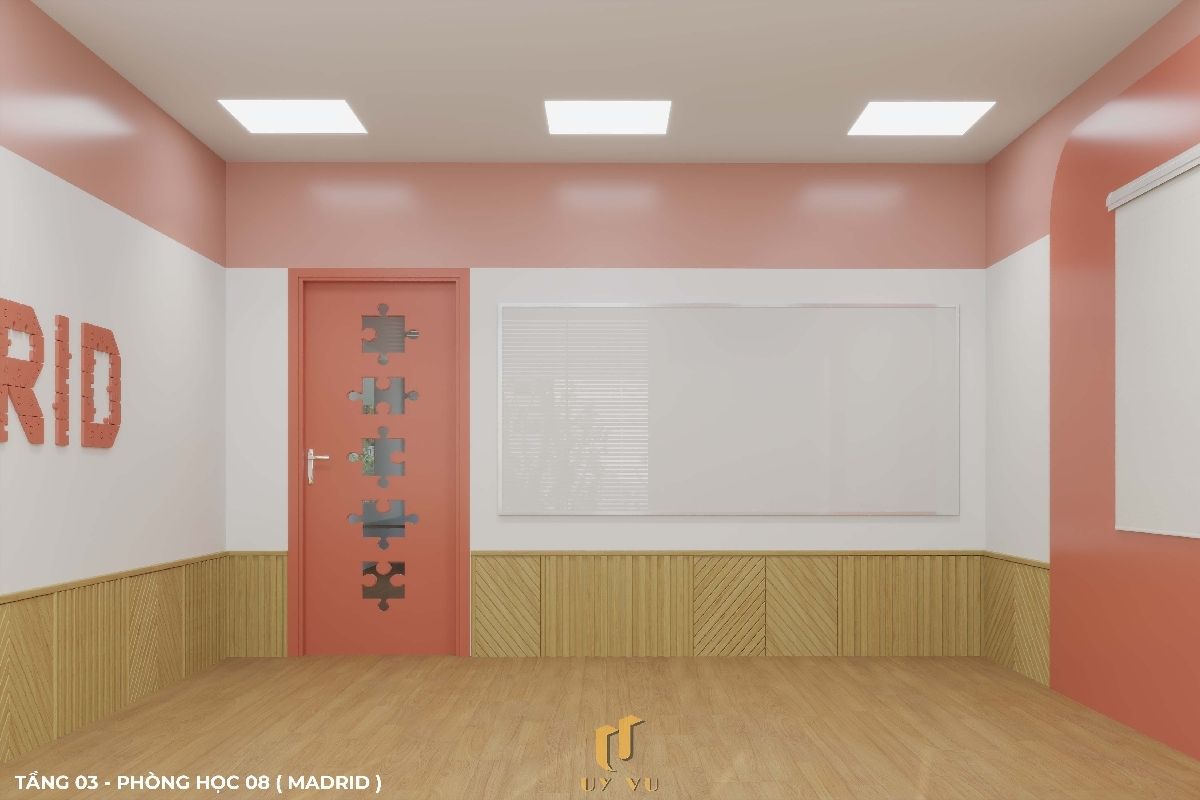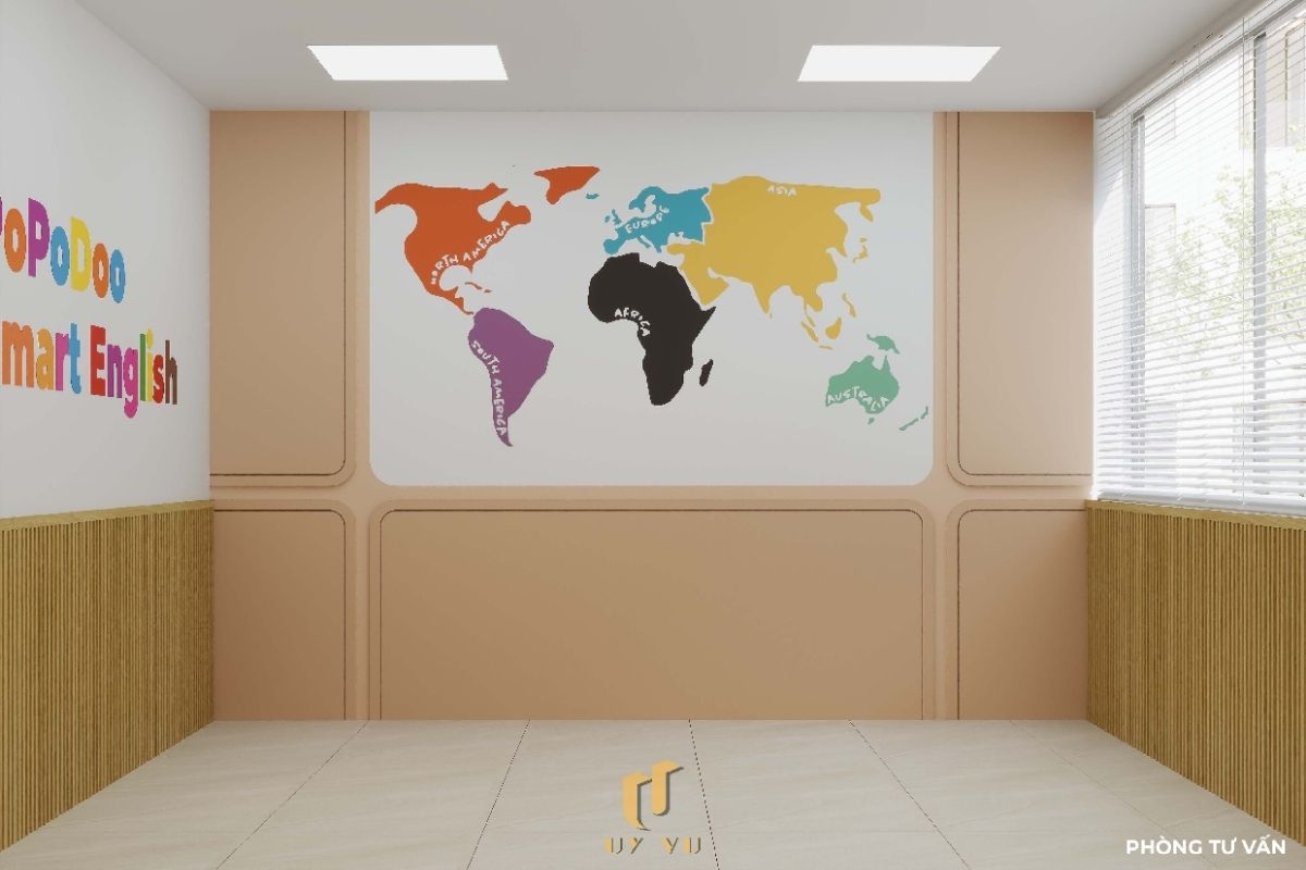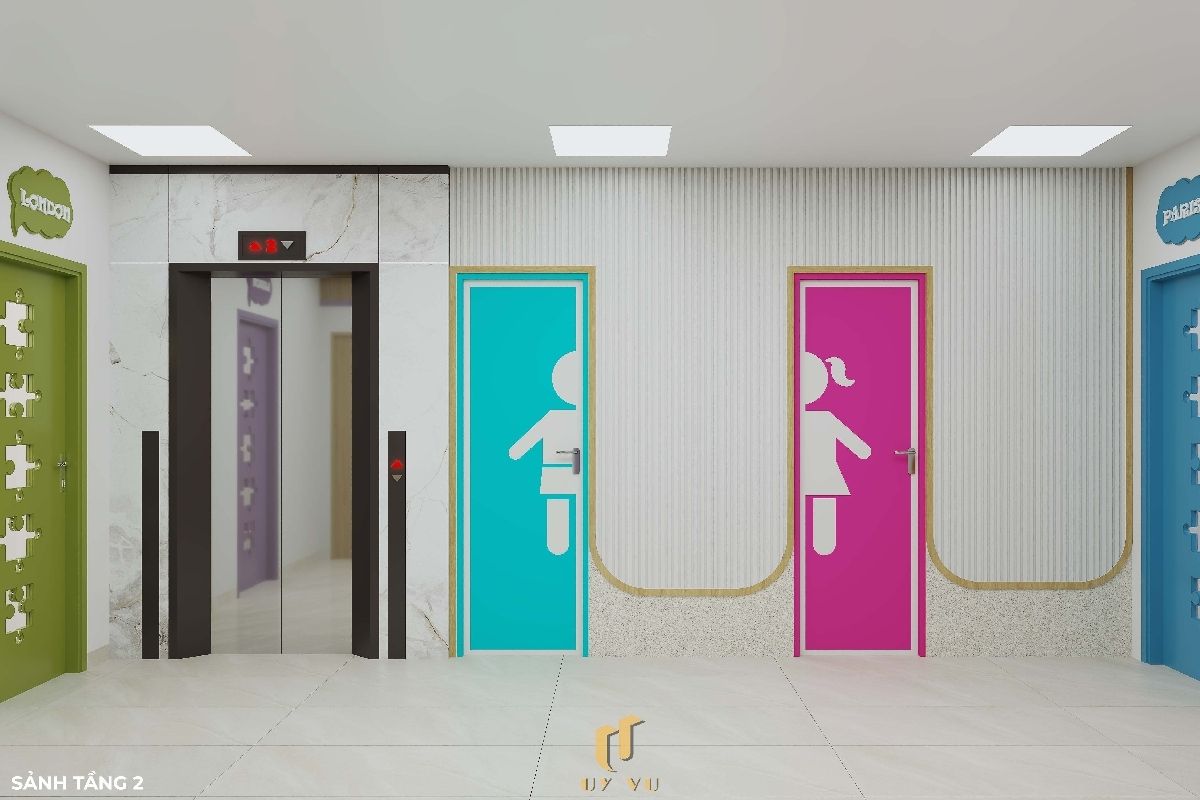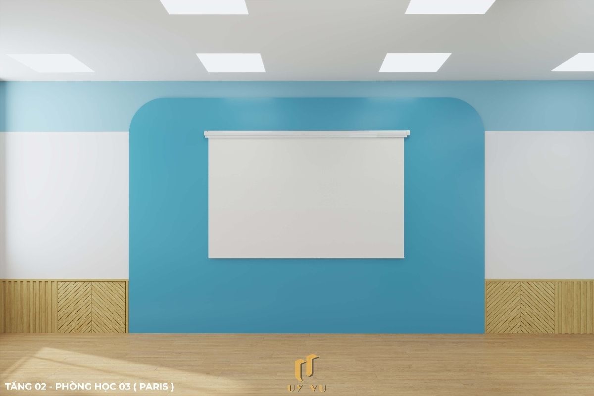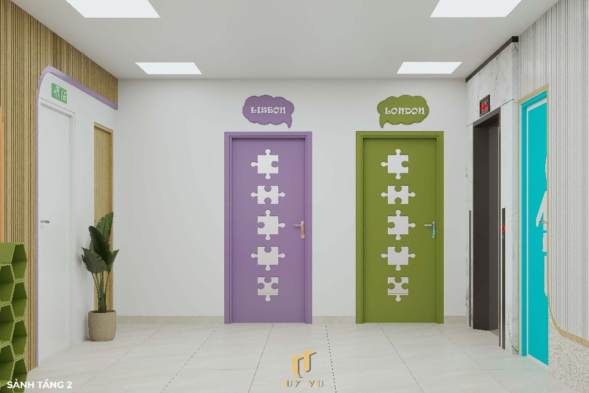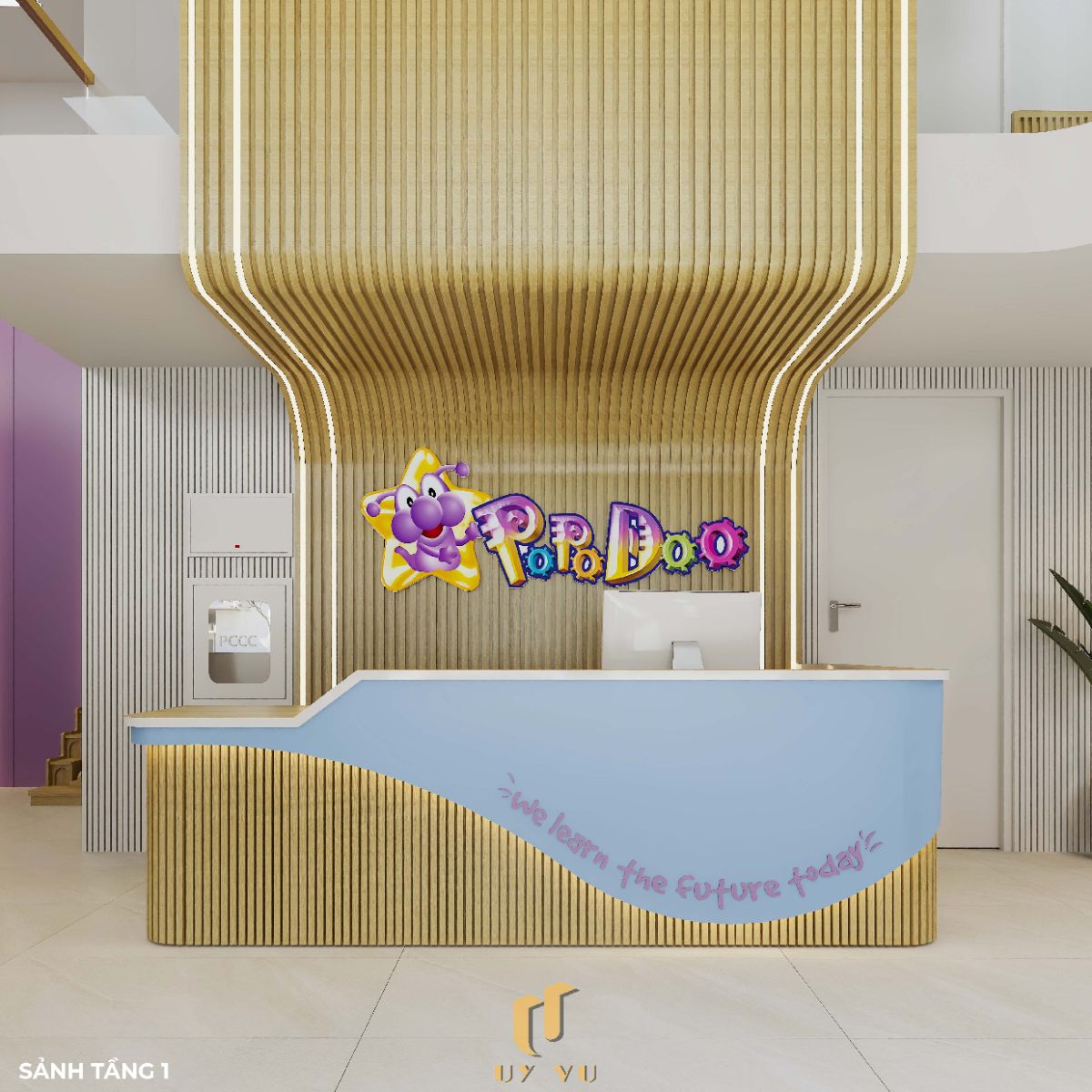 Trung tâm Anh ngữ nổi bật với thiết kế kiến trúc hiện đại, kết hợp hài hòa giữa những đường cong mềm mại và mảng màu sắc tươi sáng, tạo nên một không gian năng động và sáng tạo.