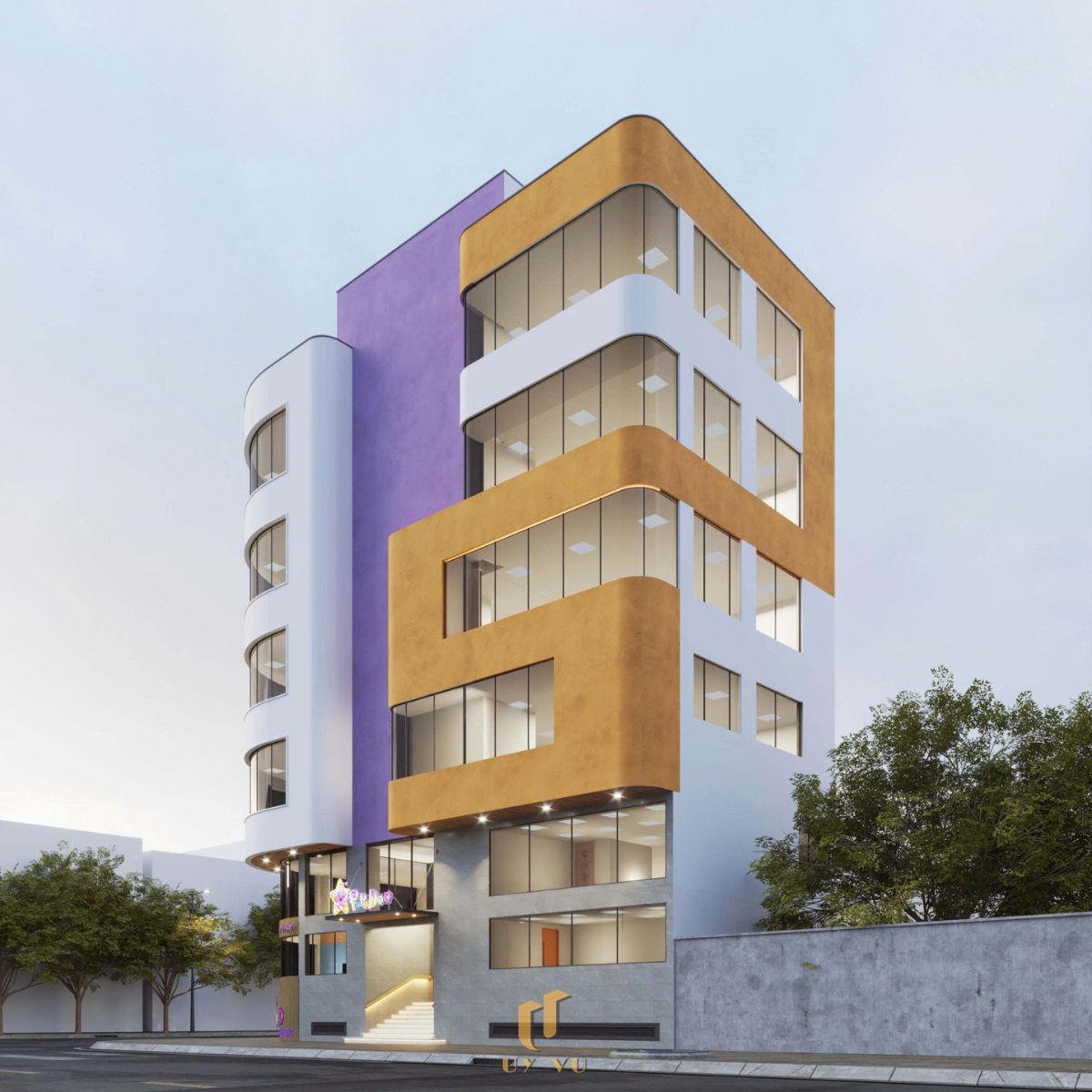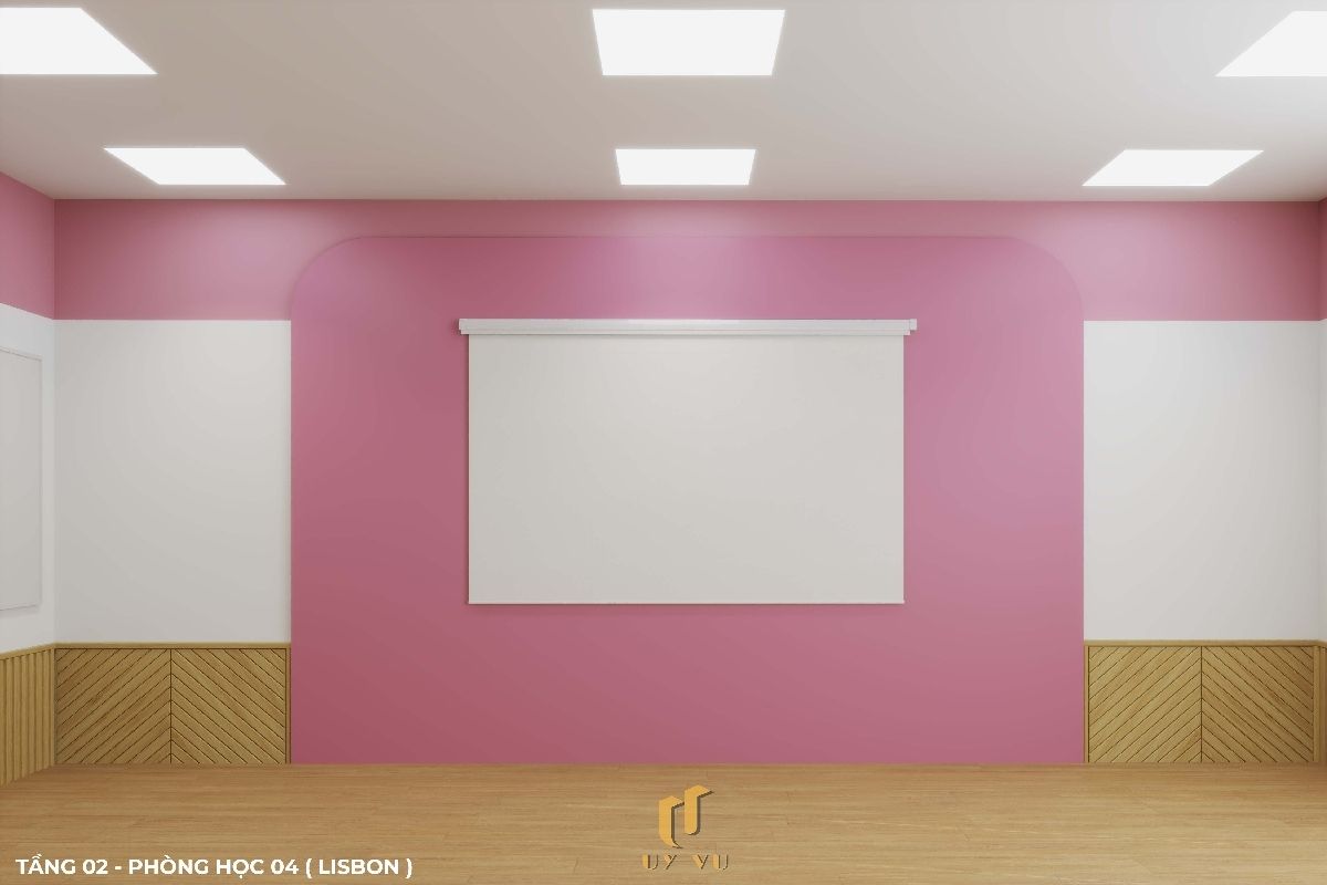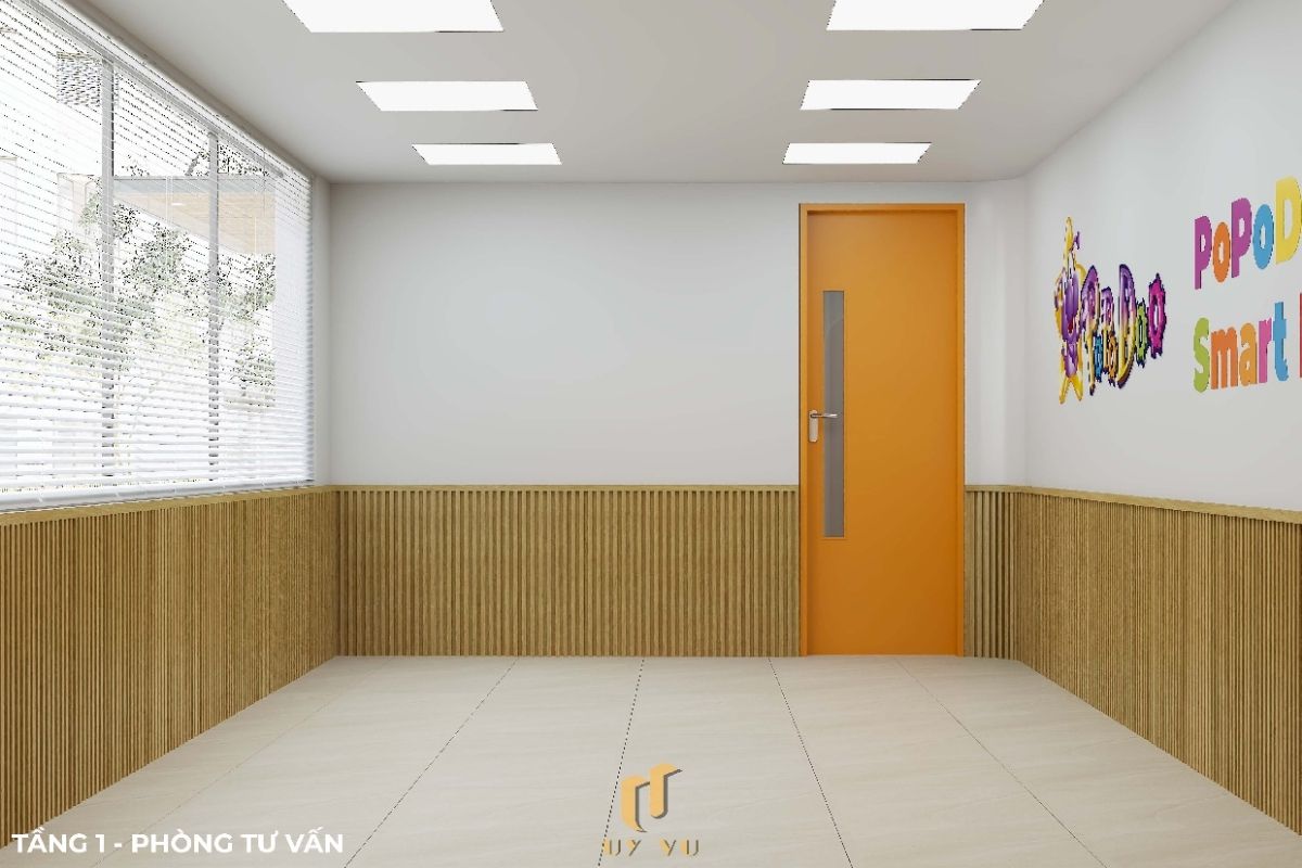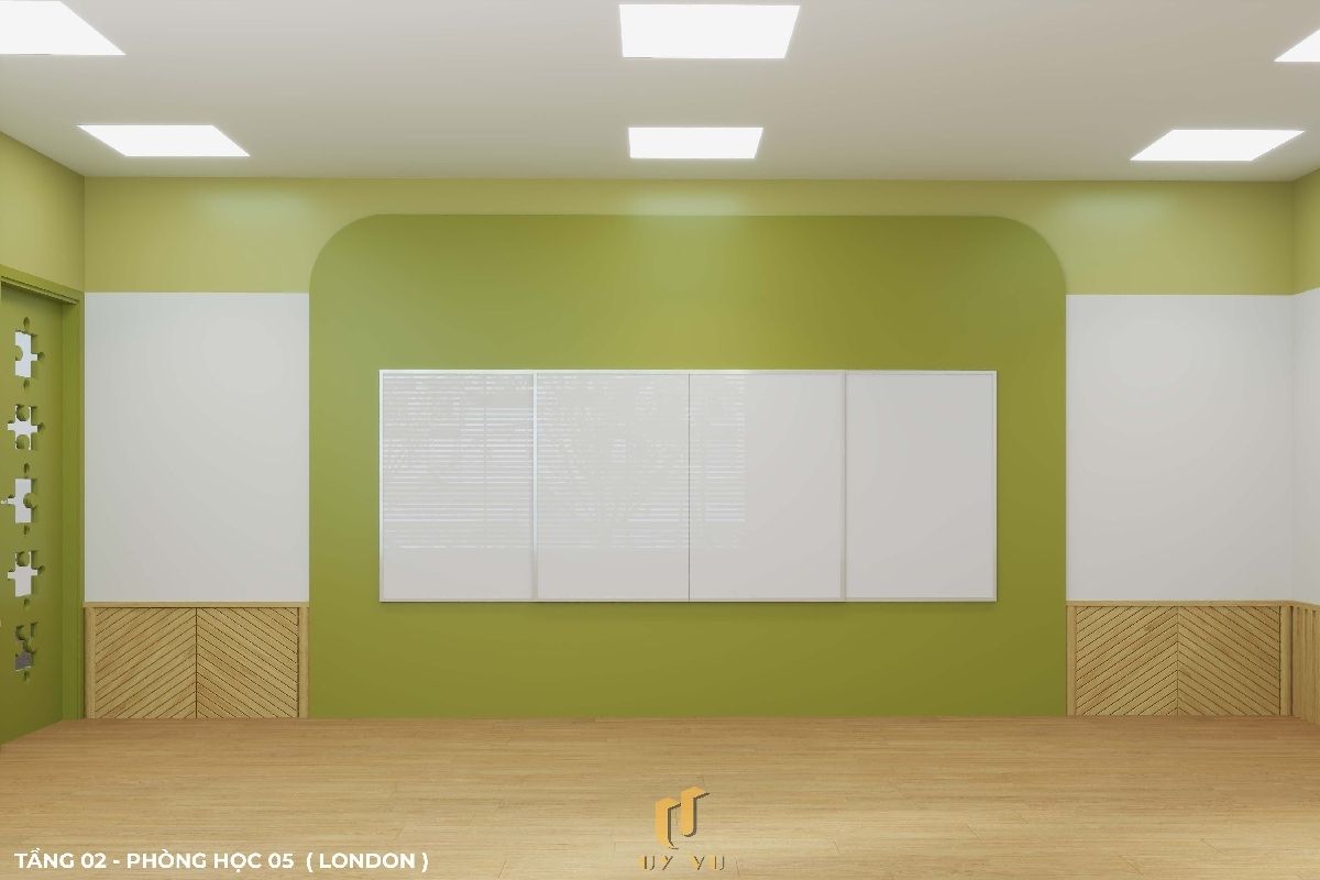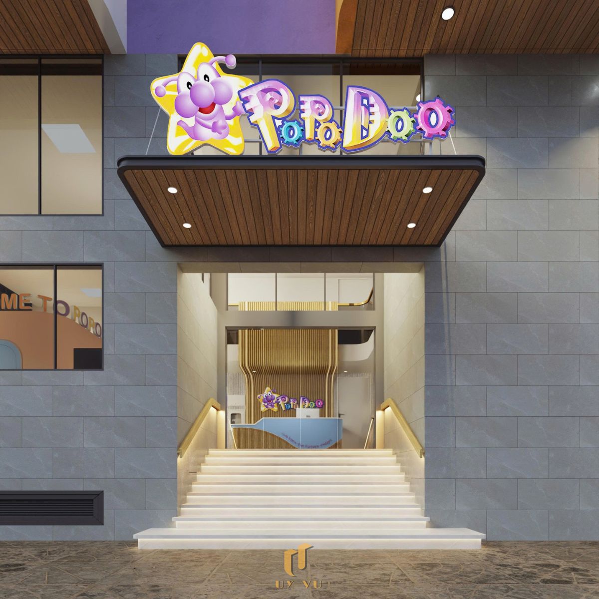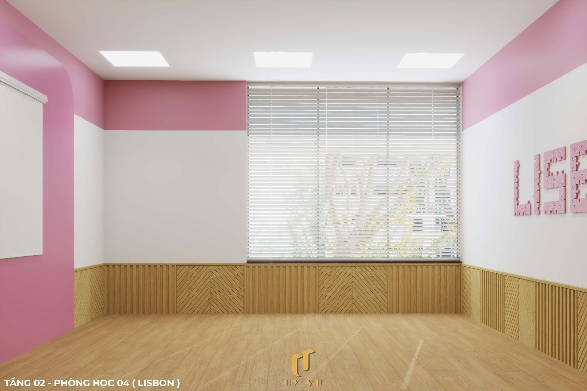 Trung tâm Anh ngữ nổi bật với thiết kế kiến trúc hiện đại, kết hợp hài hòa giữa những đường cong mềm mại và mảng màu sắc tươi sáng, tạo nên một không gian năng động và sáng tạo.