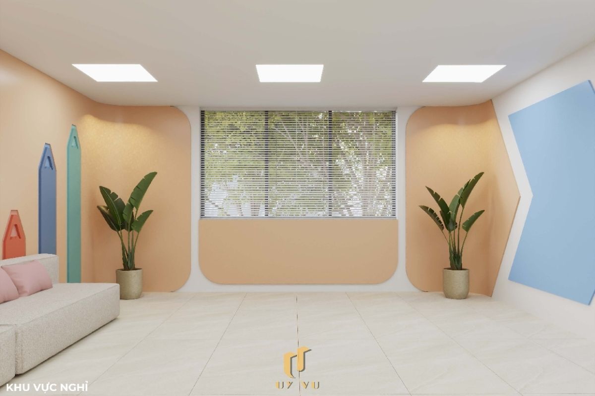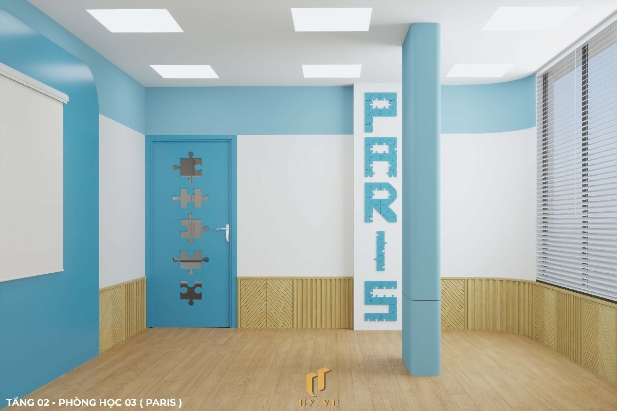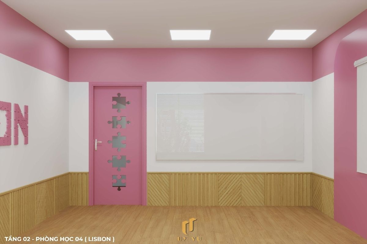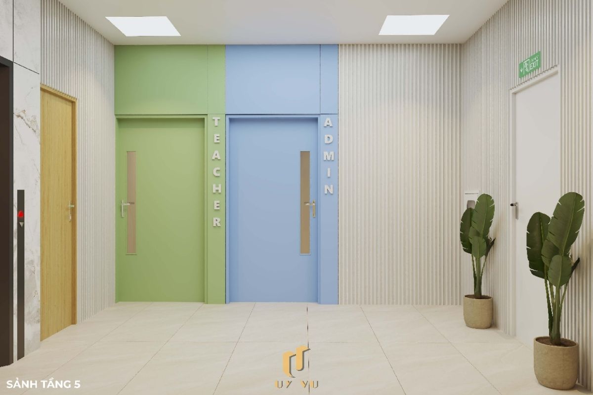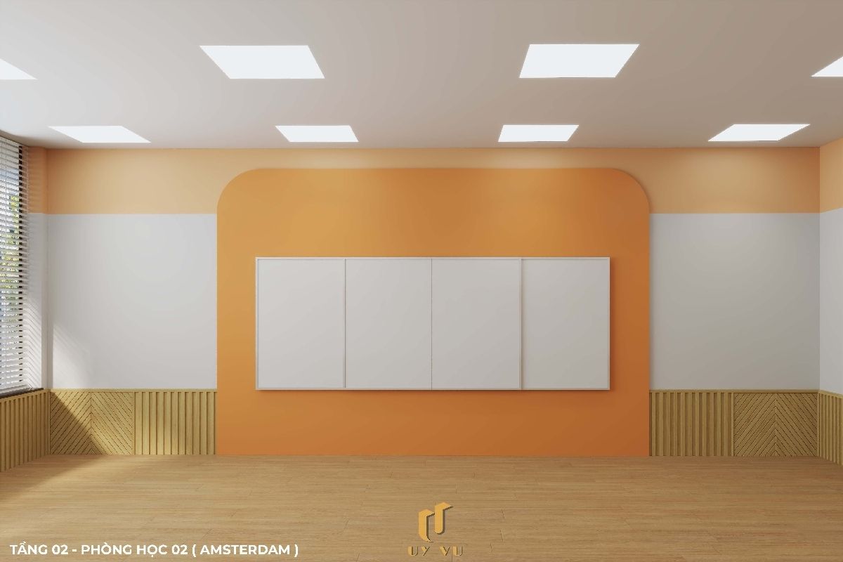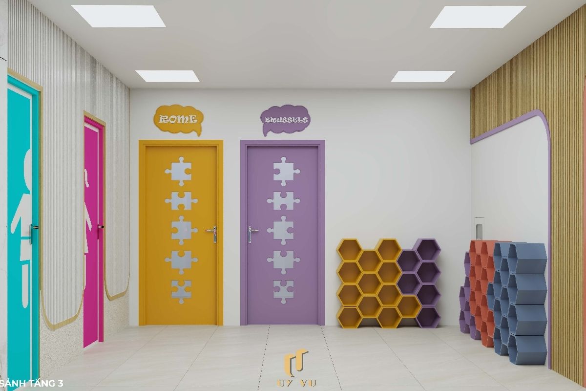 Trung tâm Anh ngữ nổi bật với thiết kế kiến trúc hiện đại, kết hợp hài hòa giữa những đường cong mềm mại và mảng màu sắc tươi sáng, tạo nên một không gian năng động và sáng tạo.