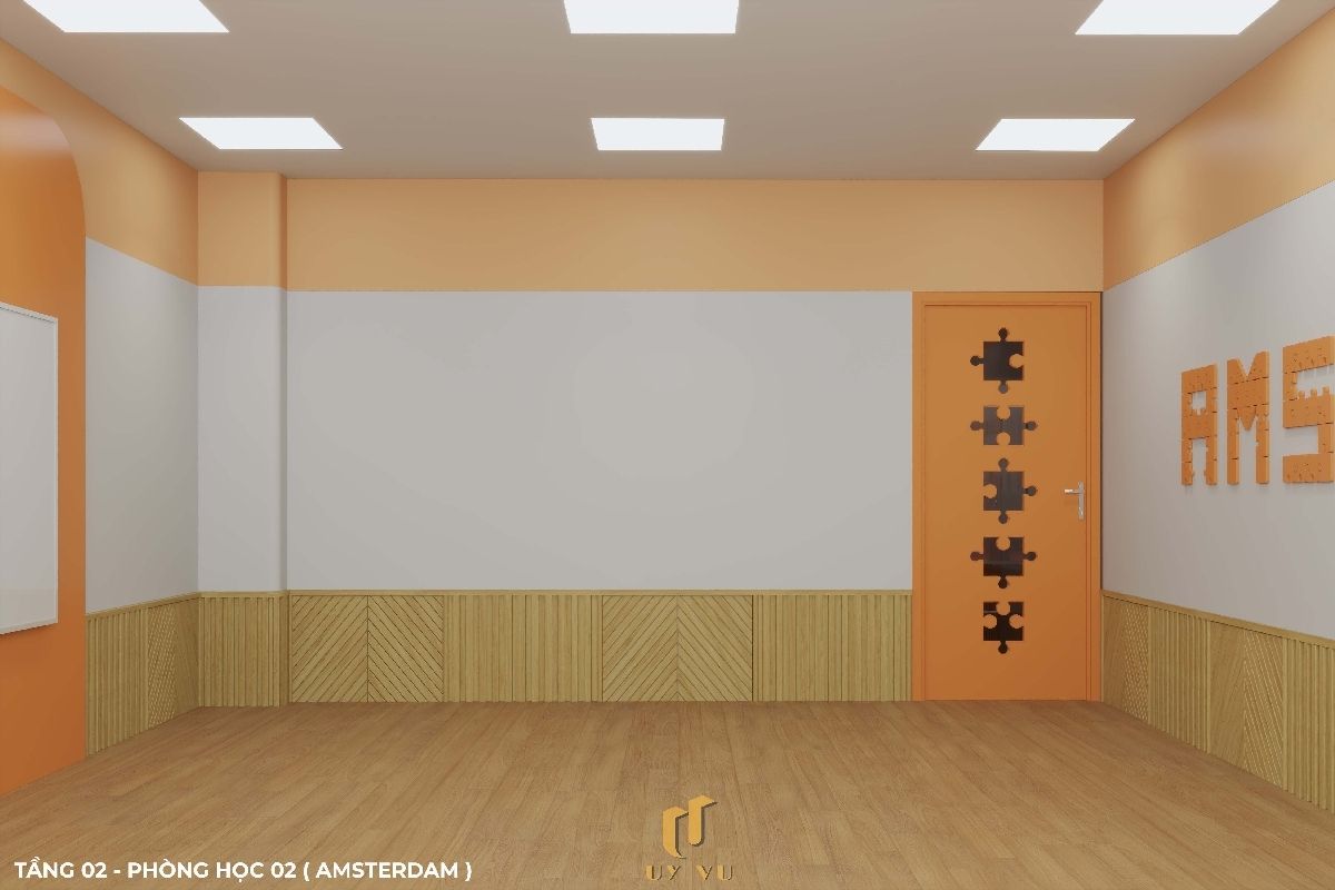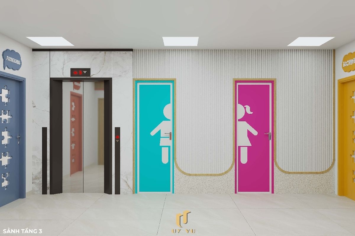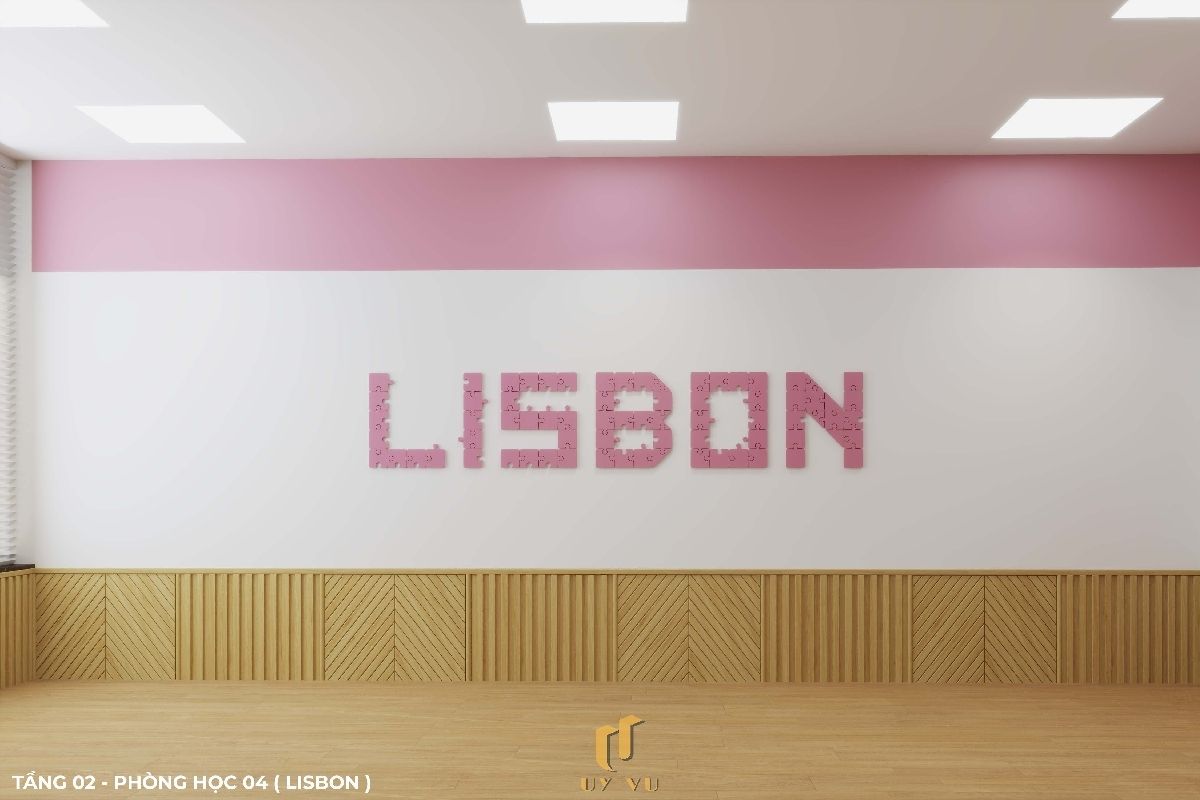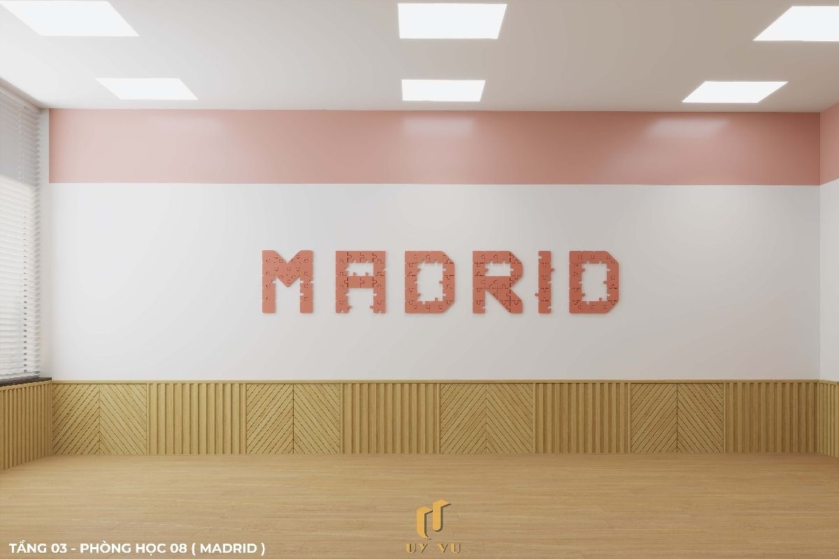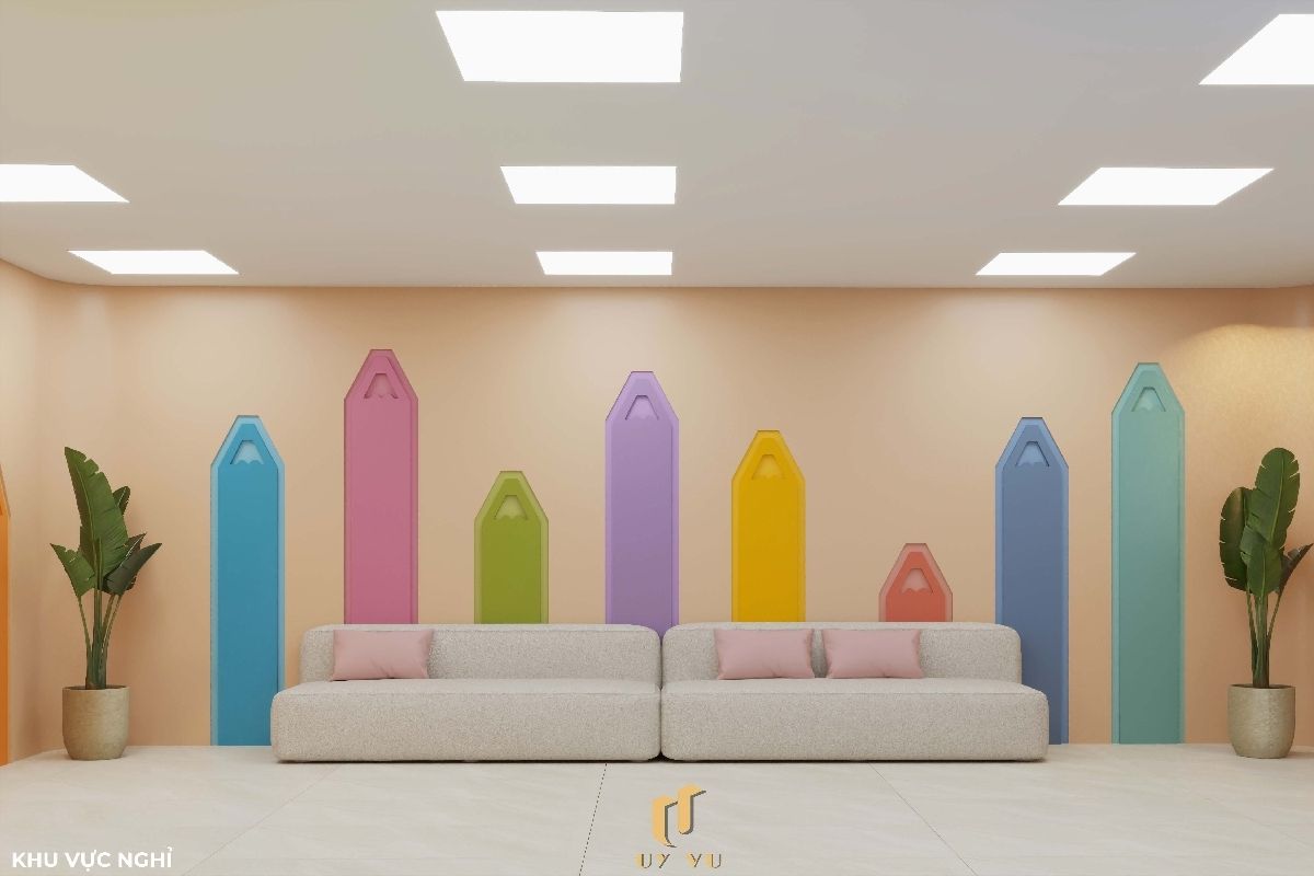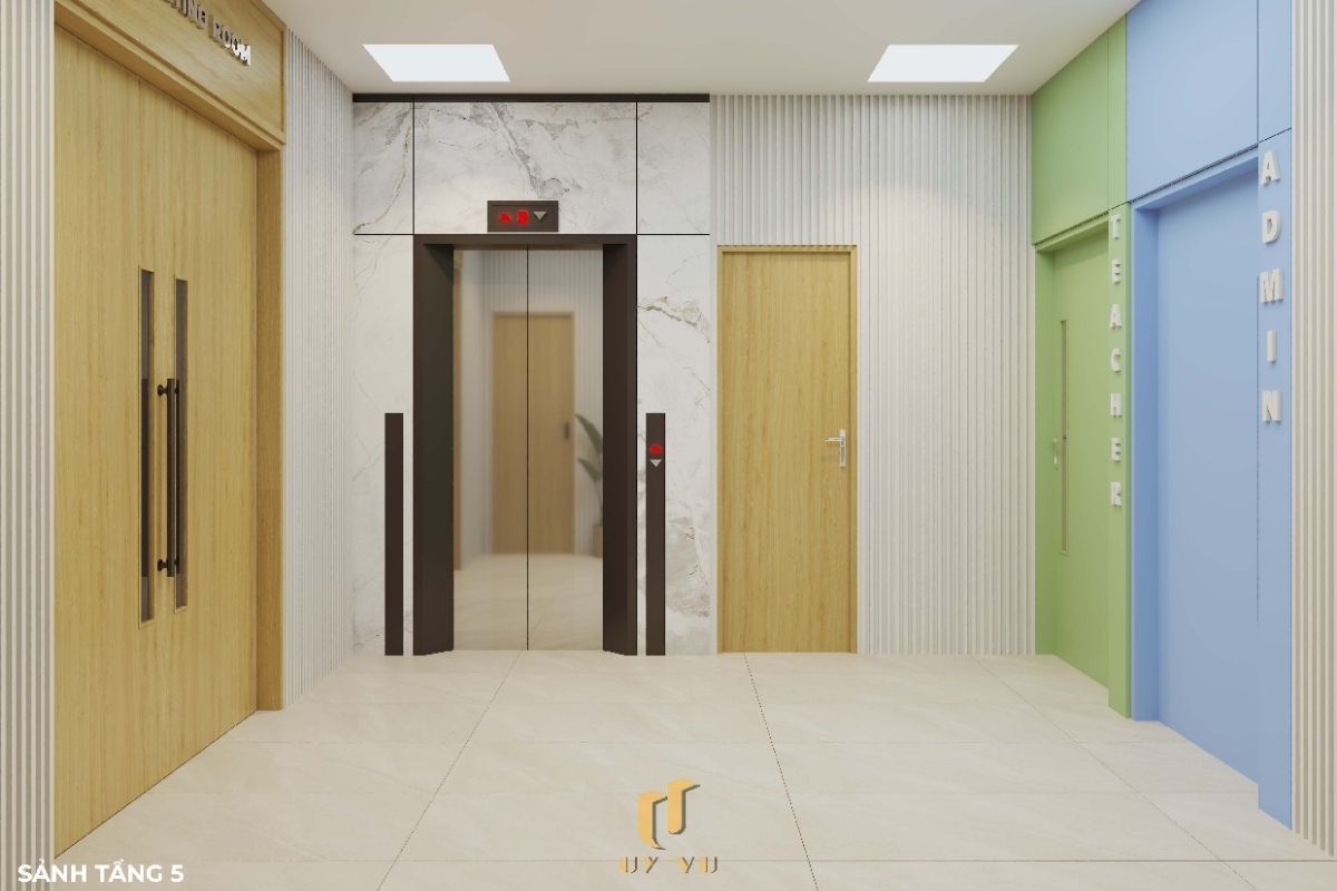 Trung tâm Anh ngữ nổi bật với thiết kế kiến trúc hiện đại, kết hợp hài hòa giữa những đường cong mềm mại và mảng màu sắc tươi sáng, tạo nên một không gian năng động và sáng tạo.